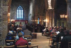 Der Weg zum gemeinsamen Mittagessen im Klosterrefektorium führt durch den Kreuzgang entlang verwitterter Grabsteine. Dann kommt ein großer Raum mit Tischen und Sitzbänken. Eine Musikergruppe aus Südafrika trommelt begeistert und selbst die britischen Gäste beginnen zu tanzen. In einer Ecke blickt derweil die Bronzebüste von George McLeod ernst auf das Geschehen. Anschließend schöpfen Helfer Suppe aus großen Bottichen. Zum Nachtisch gibt es schottische Scones mit Marmelade. Hier unter den Teilnehme